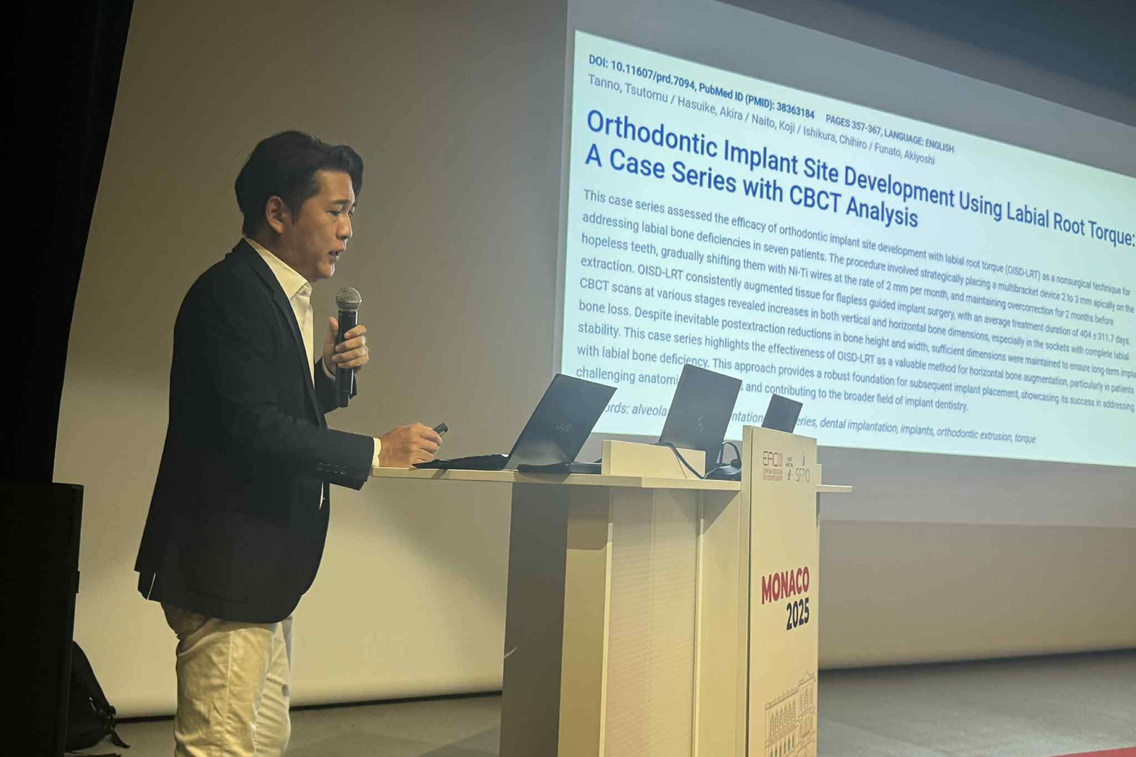 この舞台で、当院院長・丹野努が「Labial Root Torque(歯の傾きを調整する動き)を活用したインプラント部位の開発」について発表し、大きな注目を集めました。